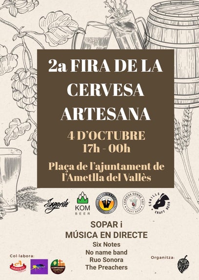 La Fira de la Cervesa Artesana és una iniciativa que neix amb la voluntat de donar a conèixer les cerveses de proximitat i, alhora, dinamitzar la vida cultural i social del municipi. Una combinació de gastronomia, música i bon ambient que farà de l’Ametlla del Vallès un punt de trobada obligat aquest inici de tardor.